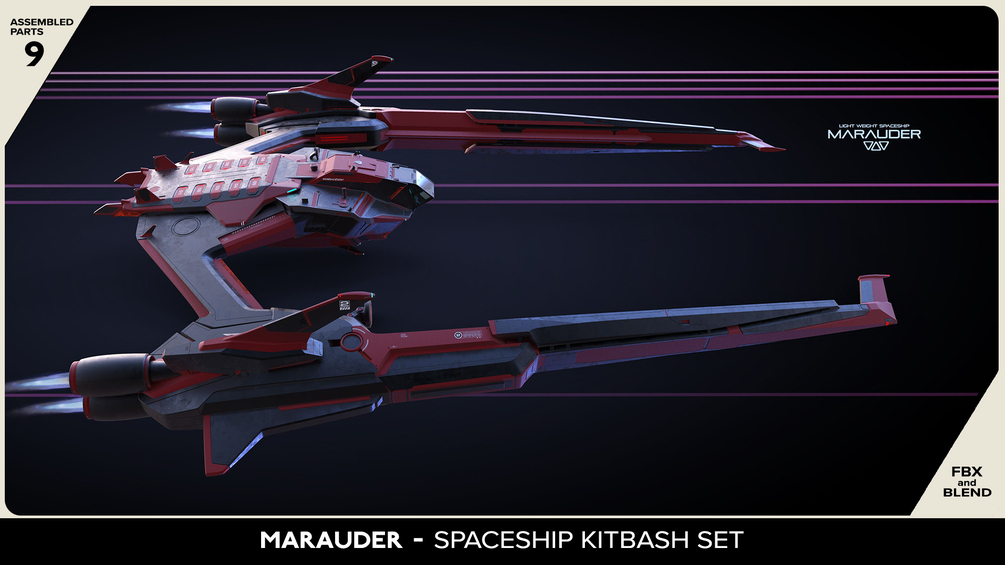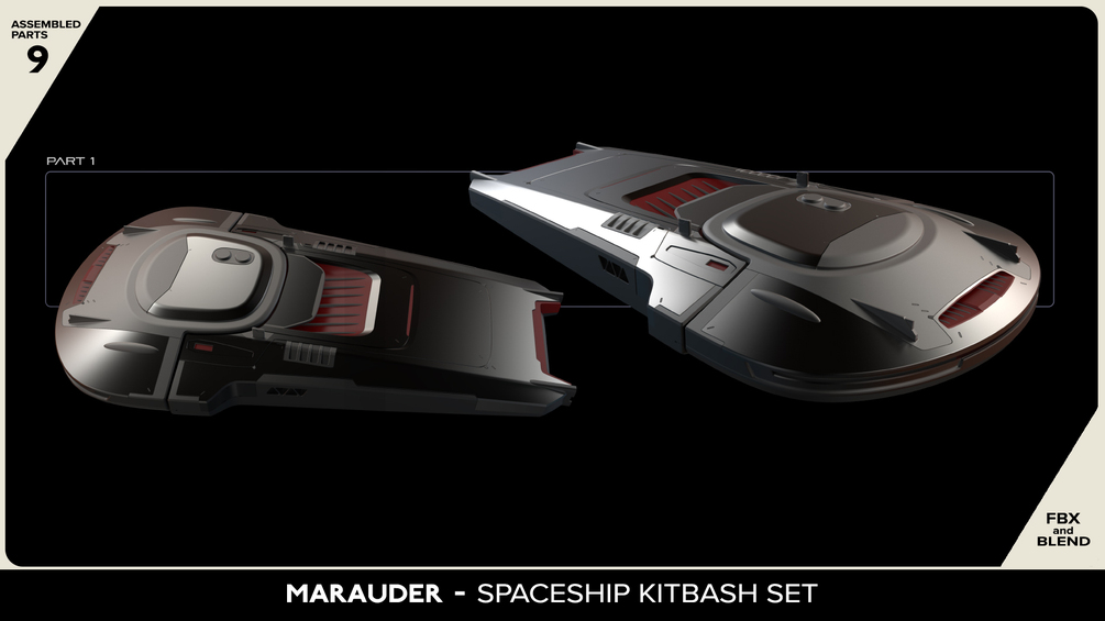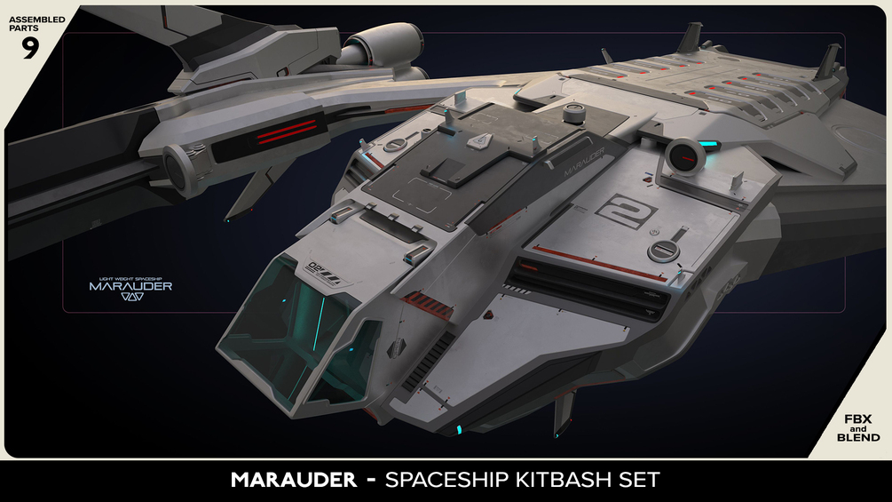 FBX and Blen Files with a set of nine assembled spaceship parts.